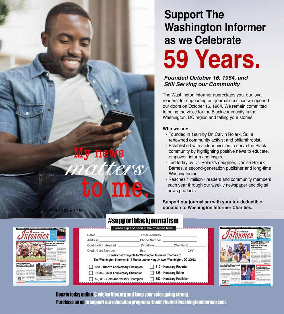 THE WASHINGTON INFORMER NEWSPAPER (ISSN#0741-9414) is published weekly on each Thursday. Periodicals postage paid at Washington, D.C. and additional mailing offices. News and advertising deadline is Monday prior to publication. Announcements must be received two weeks prior to event. Copyright 2016 by The Washington Informer. All rights reserved. POSTMASTER: Send change of addresses to The Washington Informer, 3117 Martin Luther King, Jr. Ave., S.E. Washington, D.C. 20032. No part of this publication may be reproduced without written permission from the publisher. The Informer Newspaper cannot guarantee the return of photographs. Subscription rates are $55 per year, two years $70. Papers will be received not more than a week after publication. Make checks payable to: