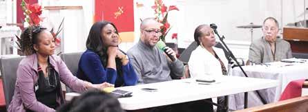 3 (L-R) Matthew Brown, David Gadis and Kirsten Williams of DC Water, alongside others, answer the community’s questions about the Potomac Interceptor collapse and overflow after an hour of presentations detailing the response and repair plan. (Mya Trujillo/The Washington Informer)