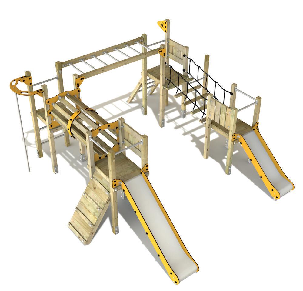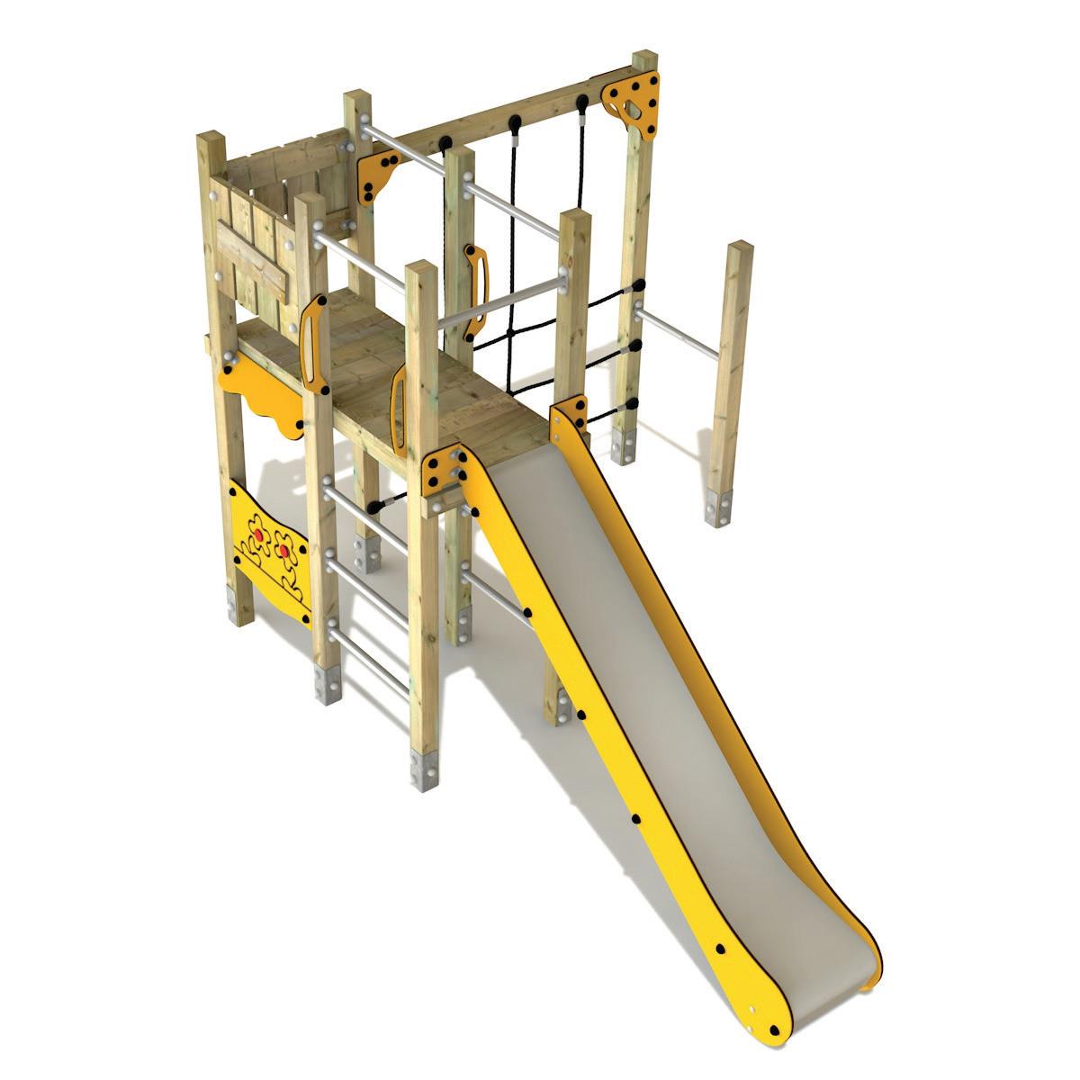 Diese Serie zeichnet sich durch ihre kleinkindgerechte Gestaltung aus und bietet dank der niedrigen Podesthöhen zwischen 60 und 90 cm einen einfachen Zugang für die jüngsten Spielplatzbesucher. Farbliche Elemente aus 80 % recyceltem HDPE verleihen den Spielgeräten einen verspielten Look, während stabile 9x9 cm Pfosten für maximale Sicherheit sorgen.