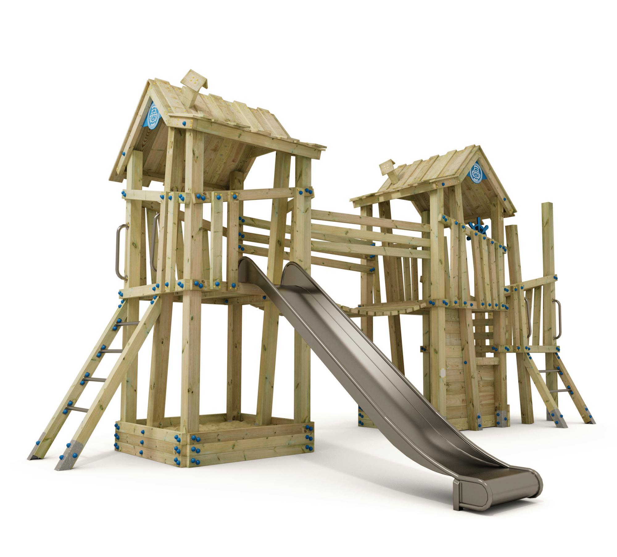 Die GIANT-Serie besticht durch ihr robustes Design mit massiven 11x11 cm Pfosten und überwiegend hölzernen Elementen. Die Spieltürme bieten einen neutralen Look, der in jede Umgebung passt. Die Gerüste sind je nach Modell in geradliniger oder schräger, verspielter Form erhältlich.
