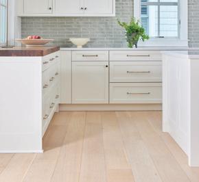 The finish is crafted from a slightly heavier white base, enriched with a touch of yellow and a hint of brown, forming a creamy glaze. Hand-buffed and carefully removed, the pigment settles mostly within the open grain, accentuating natural patterns without overpowering them. The resulting subtle, gorgeous layering produces greater grain contrast, setting off cabinetry and painted surfaces as a perfect complement to the flowing lines of the wood grain. Weekend Cottage fills rooms with gentle comfort and classic warmth.