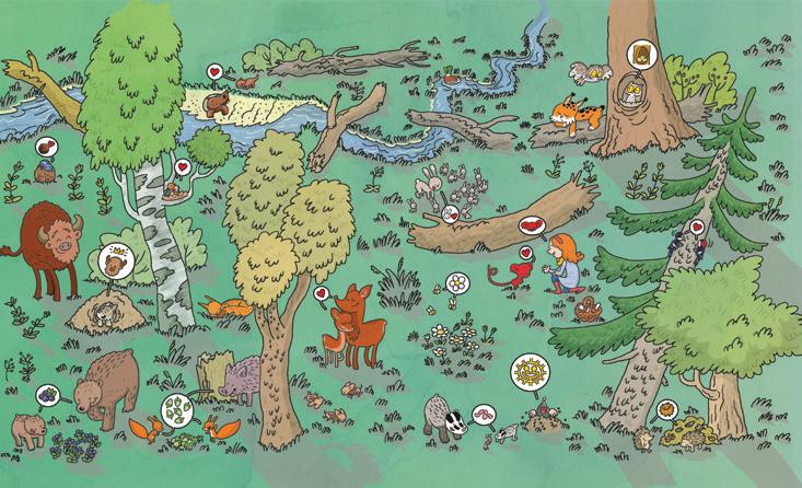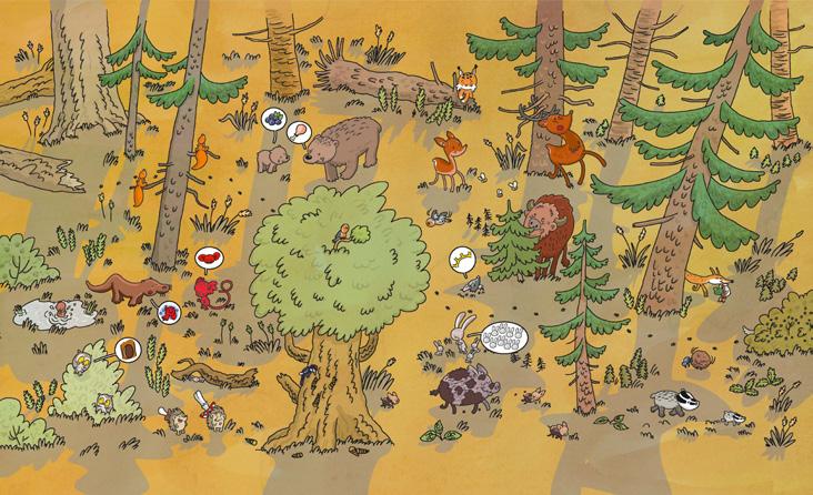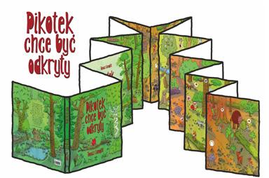 The book tells the story of a nonexistent animal (Pikotek), who dreams to be discovered. It travels through the forest, meets a lot of animals, and asks each one if they ever met anyone like it. Every animal it meets can see something different in it, but something already known: a bear, a bat, or even a flower. At the same time, in the background, the life of the forest continues, shown in twelve other stories (connected to other animals, for example, a fox, a lynx, a bear, wild boar, or hare) which can be followed independently. It is something in-between a silent book and a cartoon. All of the communication is carried out in the form of pictograms hence the book is understandable for younger children, while an older reader will easier relate to the book’s humour.
