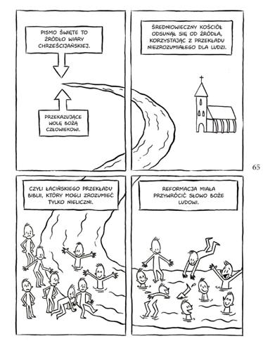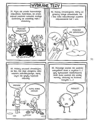 The plot of the book starts with the childhood and youth of Luther, which is placed against the background of the reality of the era. Then, the time of his studies and monastery life, to show that this was the period which shaped Luther’s outlook as a critical observer of some Church practices and the future reformer. The story then follows the dispute concerning the indulgencies, Luther’s 95 theses proclaimed in Augsburg, and his split-up from the Catholic Church. The book also tells about translating the Bible, the development of print, widening dissemination of the Holy Script, the spread of reading skills outside of the Church, development of schools and universities. Finally, it also shows the history of the establishment of the Lutheran Church and the Protestant community.