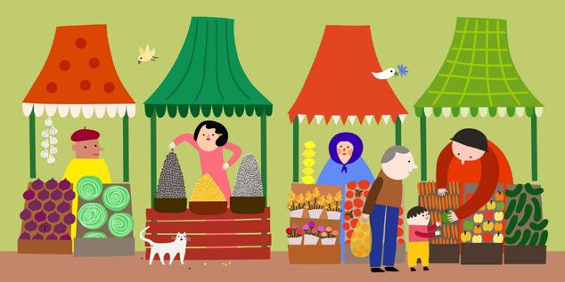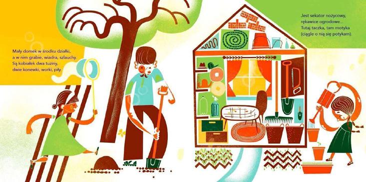 The book shows the whole multigenerational family helping him with gardening. Everyone – both the youngest and oldest – has a task. After the work is finished the whole family sits at a table to try the fruit and vegetables they have grown and collected and the preserves they have prepared.