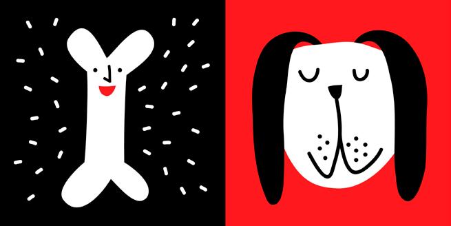 “ONE two three – we look”, for the age of 0-12 months, exercises and develops the sense of sight of a child. The Author foregoes text in favour of pictures designed to hold the sight and attention of the youngest children. It presents sharply contrasting images in black, white, yellow and red, to help the child see more clearly. Small children like to see faces, hence in this book even a banana and a doggy bone are smiling.