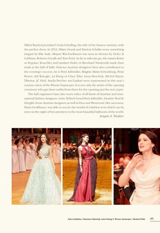 Talbot Runhof provided Ursula Schelling, the wife of the finance minister, with the perfect dress. In 2013, Hilary Swank and Patricia Schalko wore something elegant by Elie Saab. Mirjam Weichselbraun was seen in dresses by Dolce & Gabbana, Roberto Cavalli and Tom Ford. As far as tailcoats go, the names Knize or Peppino Teuschler and Lambert Hofer or Bernhard Niedersüß made their mark at the ball of balls. Famous Austrian designers have also contributed to the evening’s success, be it Fred Adlmüller, Brigitte Meier-Schomburg, Petar Petrov, Atil Kutoglu, La Hong or Claus Tyler. Lena Hoschek, Michel Mayer, Tiberius, JC Hörl, Anelia Peschev and Laskari were represented in this year’s couture salon of the Wiener Staatsoper. It is not only the artists of the opening ceremony who get their outfits from them for the opening and the red carpet. The ball organizers have also worn robes of all kinds of Austrian and international fashion designers. Lotte Tobisch loved Fred Adlmüller. Desirée TreichlStürgkh chose Austrian designers as well as Dior and Westwood. Her successor, Maria Großbauer, was able to secure the model of a fashion icon which can be seen on the night of her premiere in the most beautiful ballroom of the world. Brigitte R. Winkler