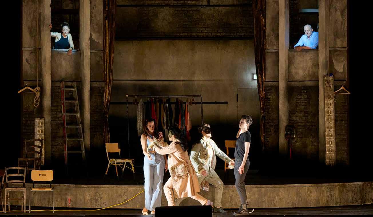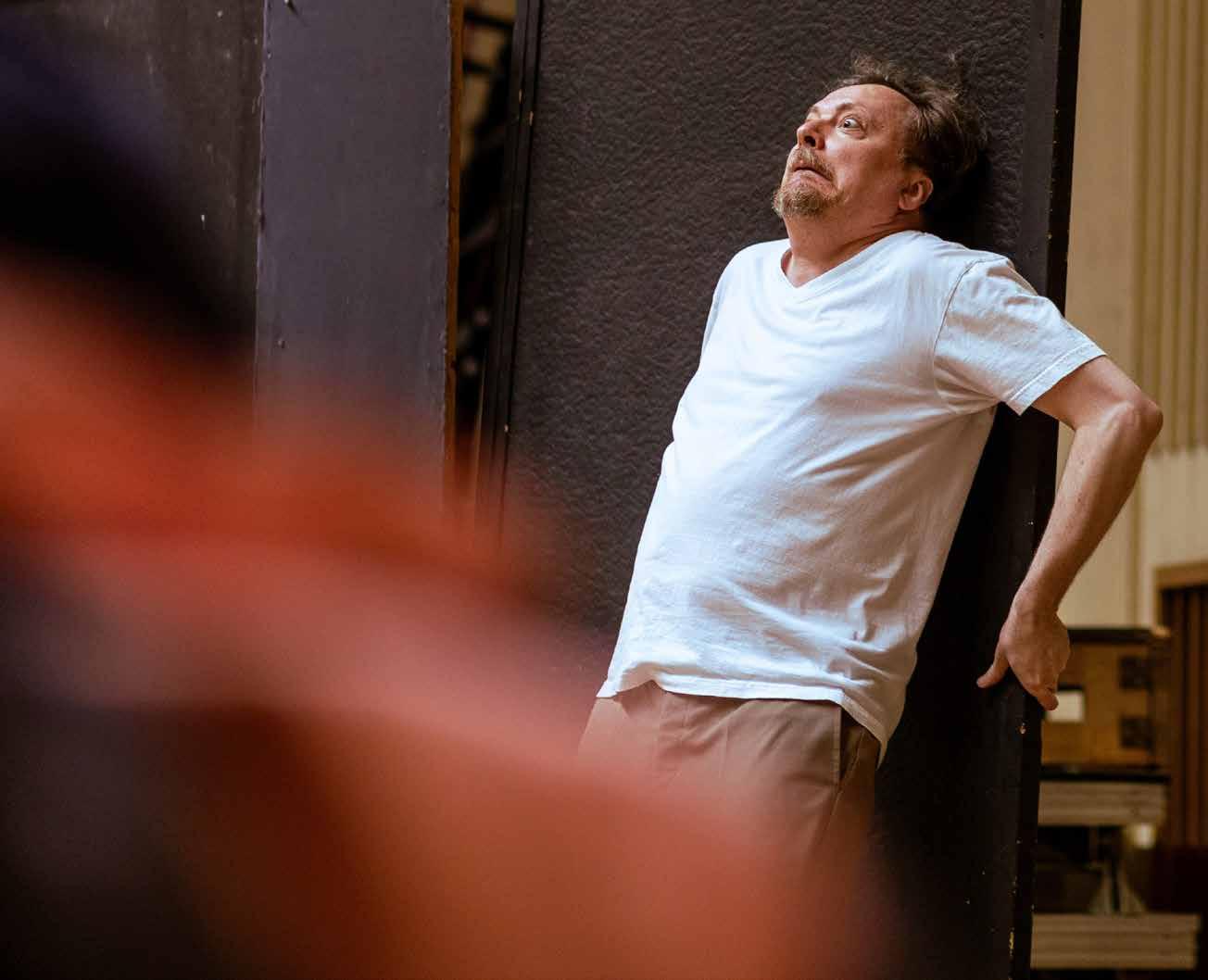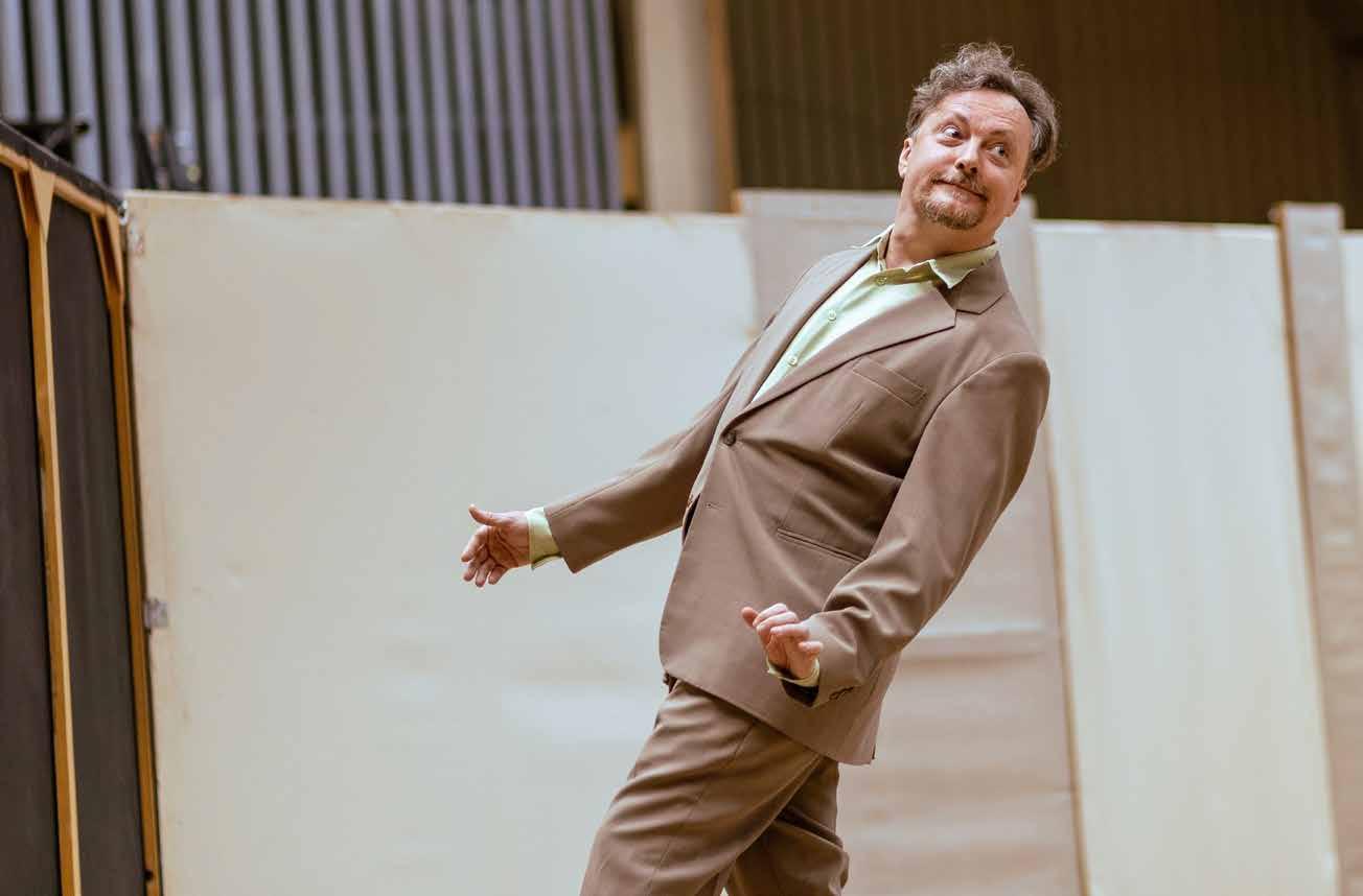 hat sich aus dem Schauspiel eine gewisse Tradition entwickelt, vor allem in Deutschland – darauf weist auch Herbert Fritsch immer wieder hin – in der das dann sehr dunkel, grau, langsam und bedeutungsvoll wurde. Sowohl Beckett als auch Kurtág sehen viel mehr Witz in der ganzen Sache –da gibt es falsch zitierten Baudelaire, falsch zitierten Shakespeare. In der Musik finden wir dann etwa ein Moment, das an Strawinski erinnert, ein anderes, das an Bartók erinnert. Diese kleinen Elemente sollen auch ein kleines Schmunzeln hervorrufen. Der schwarze Humor gehört unbedingt zum absurden Theater dazu, und Kurtág hat in den Gesangslinien immer dort leicht übertrieben, wo der böse Humor zum Tragen kommt. nis Auf den Proben kann man im Moment beobachten, welche Präzision die Sängerinnen und Sänger brauchen, um Kurtágs oft spielerisch klingende Gesangslinien im Sinne des Komponisten umzusetzen.