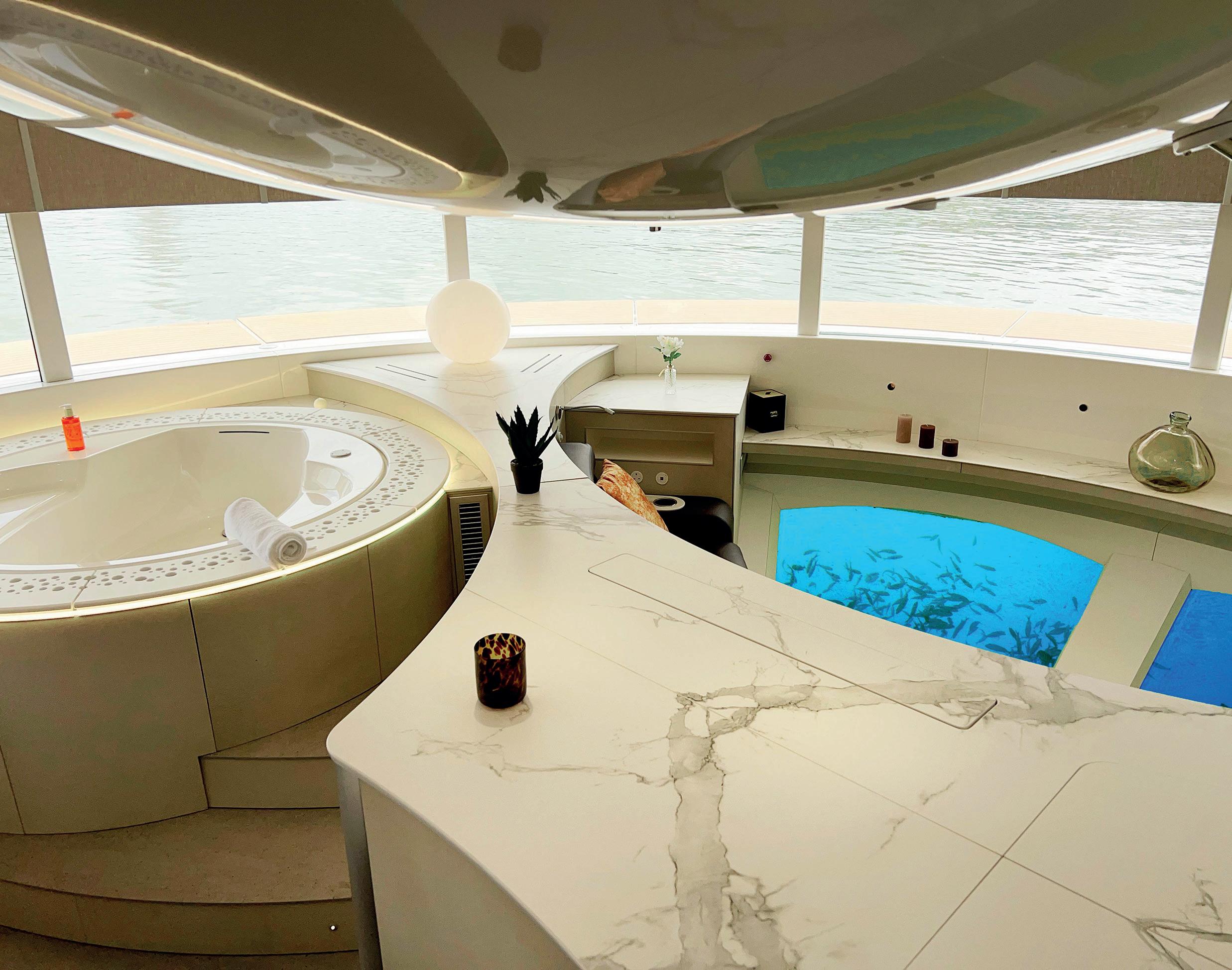 There’s no doubt that one of the Anthénea Suite’s most noteworthy features is its ability to seamlessly integrate with the marine world. Its creators compare it to a ‘lotus flower’, in the sense that it has a tranquil presence atop the seas, without impacting the ecosystem; even the ‘sand-screwing’ anchoring system works in harmony with the underwater ecosystem.