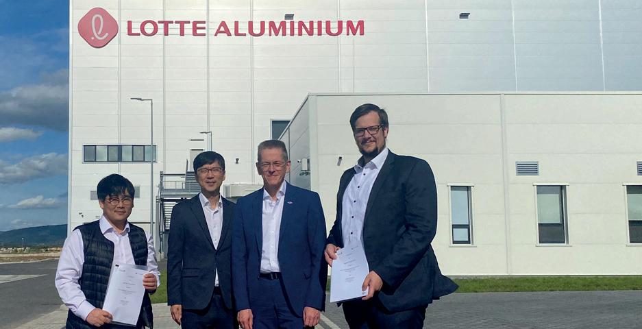 From left to right: Changhyun Park, CTO, LOTTE ALUMINIUM, USA; Eunseong Chang, CEO, LOTTE ALUMINIUM, USA; Bernd Klein, CEO, AMOVA; Daniel Opitz, Commercial Project Manager, AMOVA (PresseBox) (Düsseldorf, 29.11.2022)