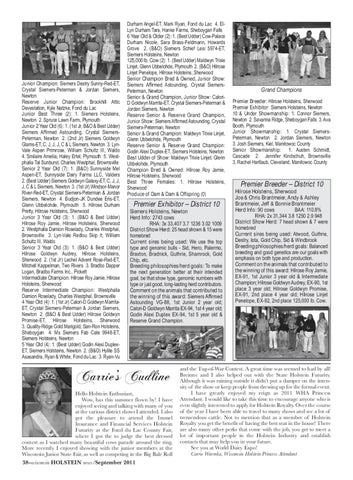 Carrie’s Cudline Hello Holstein Enthusiast, Wow, has this summer flown by! I have enjoyed seeing and talking with many of you at the various district shows I attended. I also got the pleasure to attend the Immel Insurance and Financial Services Holstein Futurity at the Fond du Lac County Fair, where I got the to judge the best dressed contest as I watched many beautiful cows parade around the ring. More recently I enjoyed showing with the junior members at the Wisconsin Junior State Fair, as well as competing in the Big Bale Roll 38–wisconsin HOLSTEIN news/September 2011