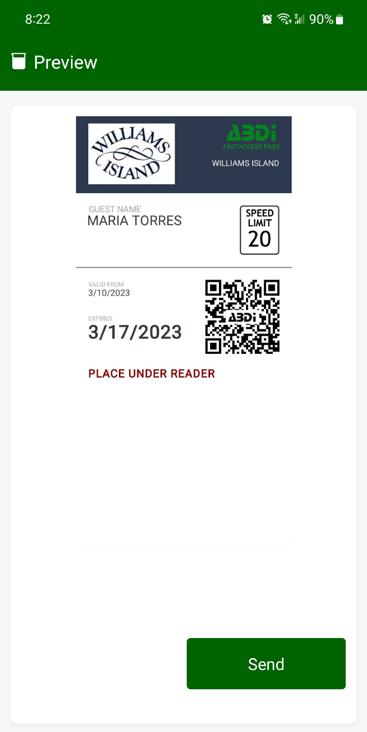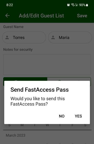 If you select YES, you will see this screen. CLICK SEND and you will then select the method to send the FAST ACCESS PASS to your guest.