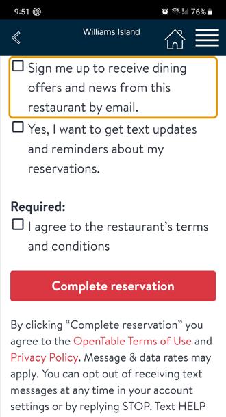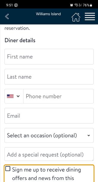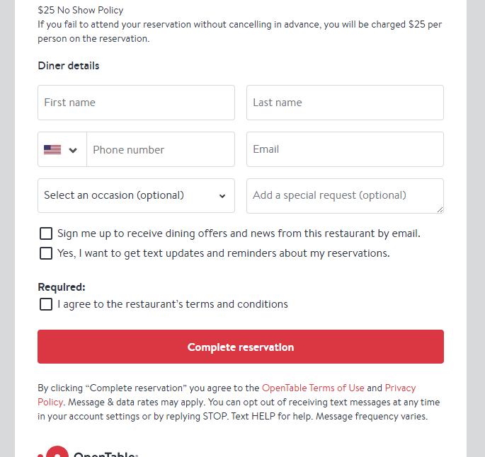 Confirm date, time and number of guests, then scroll down and enter member information and check off that you agree to the restaurant’s terms and conditions then click COMPLETE RESERVATION.