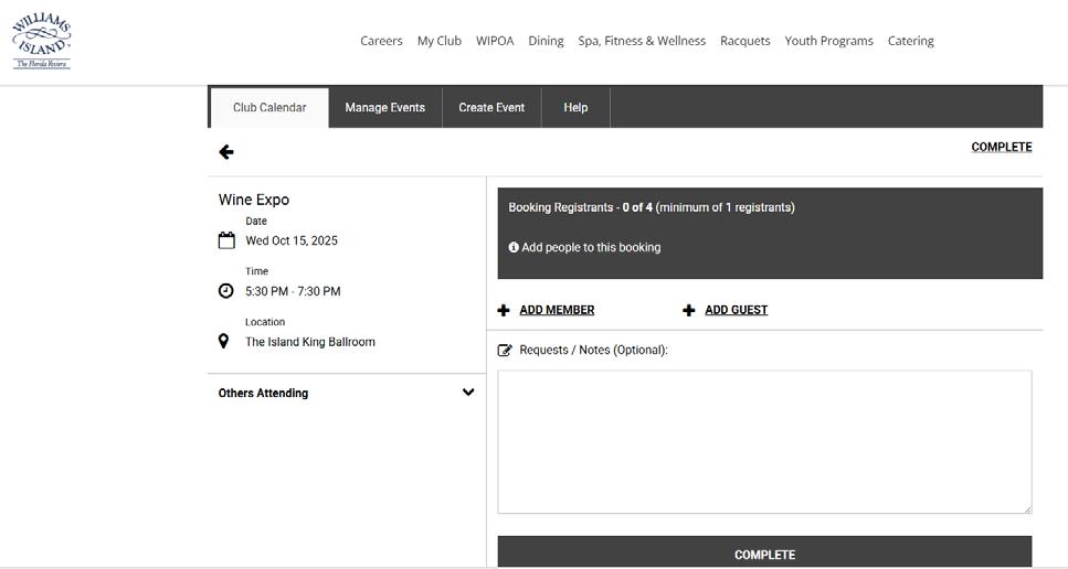 Add you and your guests (if the event allows guests). Notice that it will indicate HERE how many people you have in the reservation. Click COMPLETE.