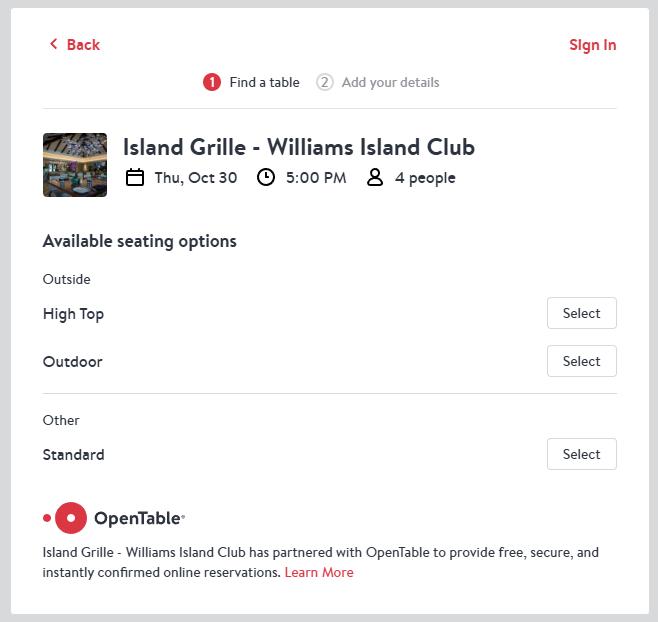 Select Island Grille or Olea depending on where you want to make the reservation.