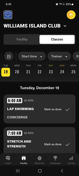 Once logged in, be sure to click the CLASSES tab to access the fitness classes.