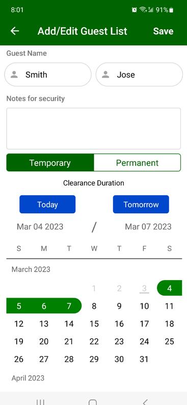Make welcoming your guests easier than ever with our Gate Access App. Simply enter your guest list in advance, and they’ll be able to move smoothly through the resident gate without delay. The app allows you to manage visitors quickly, securely, and from anywhere, ensuring a seamless experience for both you and your guests.