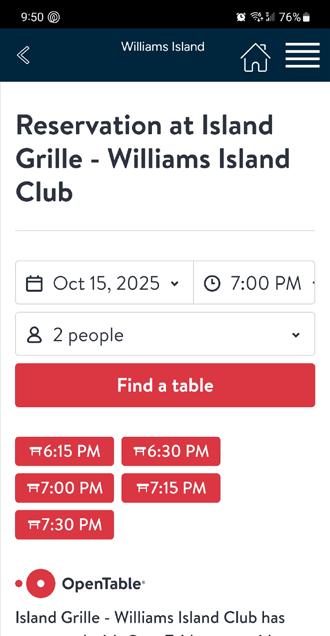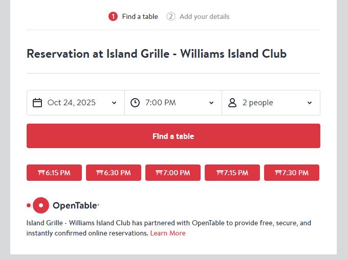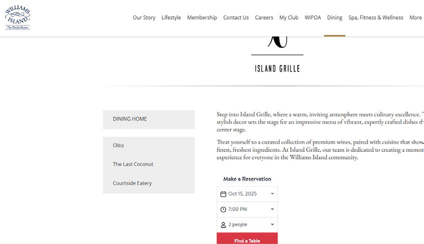 If the event flyer indicates that reservations are required through OpenTable, YOU MUST USE THE OPENTABLE LOCATED ON THE ISLAND GRILLE AND OLEA PAGES OF OUR WEBSITE OR MOBILE APP, to ensure your reservation is properly linked to the Williams Island event. This link directs your booking specifically to our event reservation system. Please note that reservations cannot be made on the regular OpenTable app.