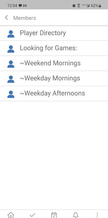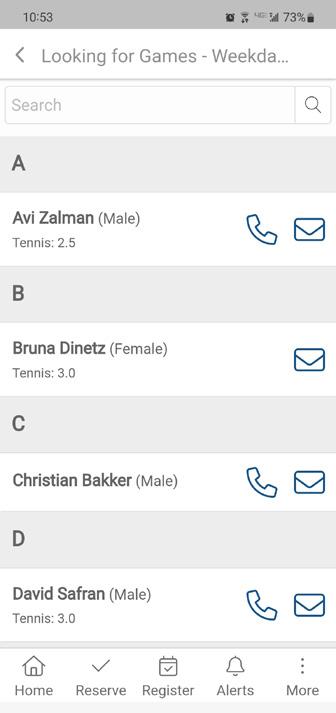 Find the person you would like to play with and you can contact them by choosing the phone icon to call or the envelope icon to email them.