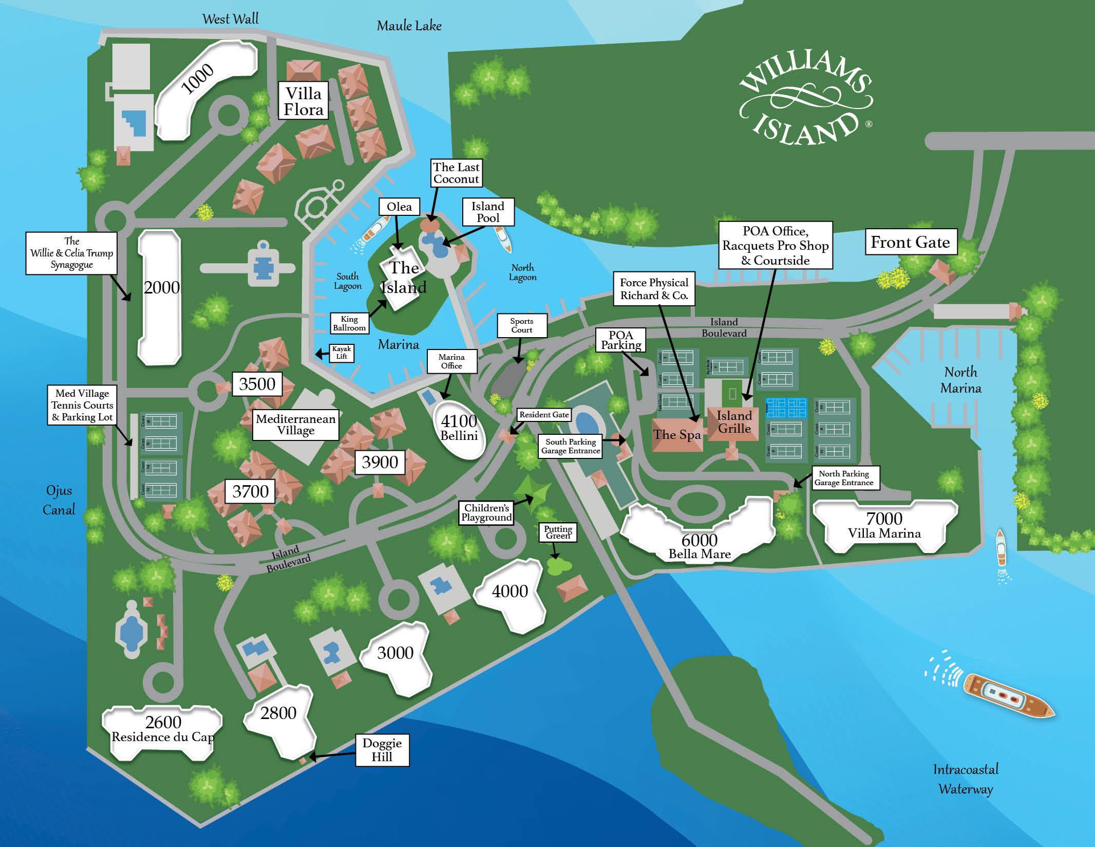 This is a detailed map of Williams Island designed to help you navigate our beautiful community with ease. The map highlights amenities, dining venues, recreational facilities, and the marinas, so you can quickly find exactly what you need. Whether you are exploring for the first time or rediscovering familiar favorites, this convenient guide puts the best of Williams Island right at your fingertips.