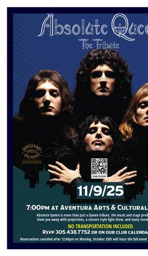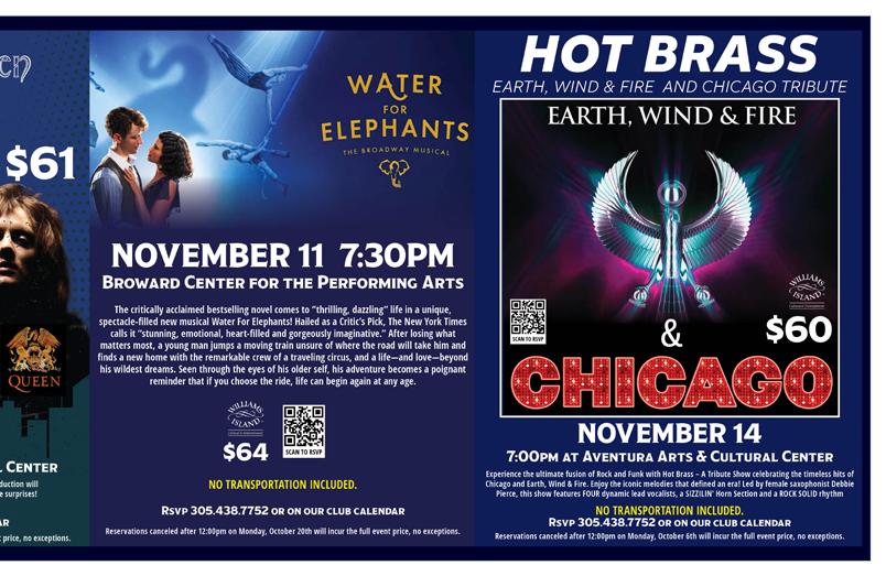 Williams Island is proud to partner with the Aventura Arts & Cultural Center and the Broward Center for the Performing Arts to bring our residents exclusive access to discounted tickets for upcoming performances. This season, members can look forward to exciting shows such as Absolute Queen, the ultimate tribute to the legendary rock band; Water for Elephants, a Broadway musical filled with spectacle and heart; and Top Brass, a high-energy showcase of Earth, Wind & Fire & Chicago Tribute.