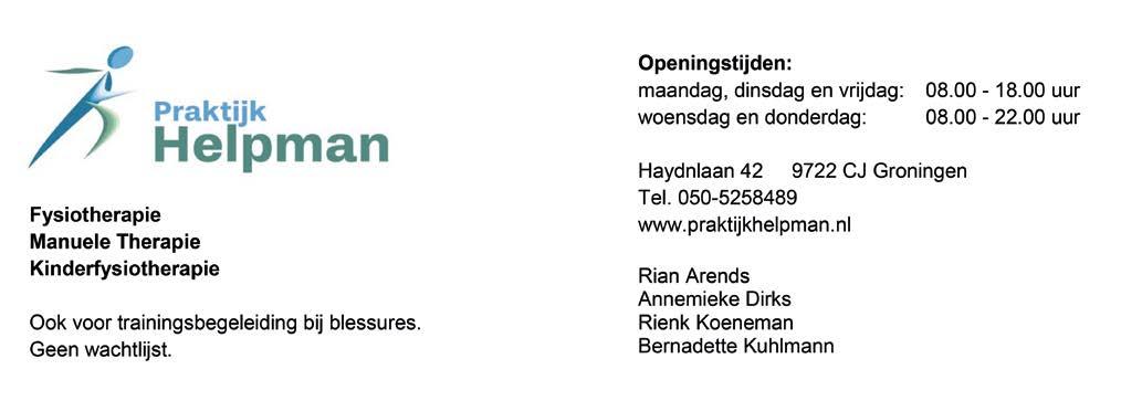 Redactie: Sjoukje Kooistra, Harm Draaijer, Ina Timmer. Eindredactie: Ina Timmer. Acquisitie advertenties: Herman Marsman. Ontwerp omslag: Rietje Beeren. Foto’s blz. 13, 15: Tjeerd Flokstra Vormgeving: Jurjen Heegstra. Druk: Scholma Print & Media, Bedum. De Helperbel wordt gedrukt op FSC papier Redactieadres: redactie@wijkhelpman.nl De
