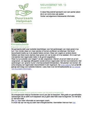 Een aantal wijkbewoners heeft aangegeven geïnteresseerd te zijn in verduurzaming van hun woning, maar zij missen regelmatig de kennis om tot de juiste beslissingen te komen. De leden van Duurzaam Helpman willen vooral voor deze laatste groep een ondersteunende rol vervullen. Door middel van (onregelmatig verschijnende) nieuwsbrieven worden belangstellenden op de hoogte gehouden. Alle activiteiten zijn ook te vinden op: www.duurzaamhelpman.nl.