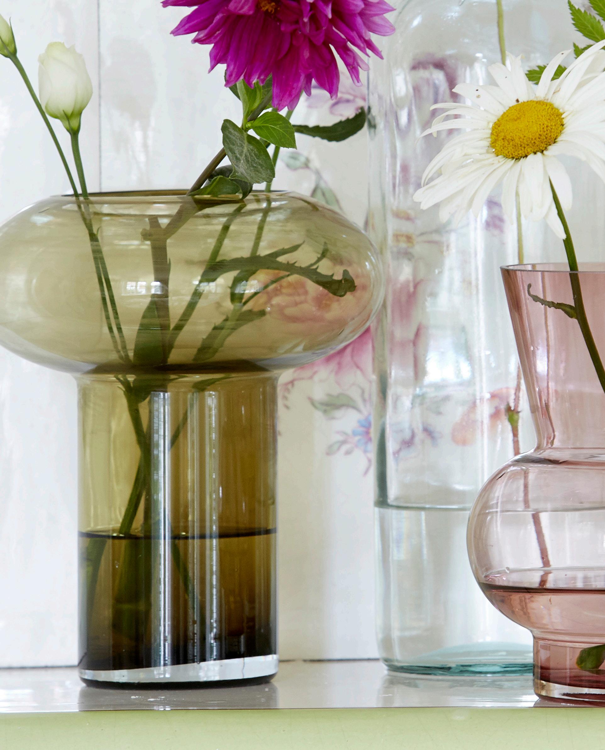 TINTED GLASS IS FUN, ESPECIALLY IN COMBINATIONS WITH SIMPLE CLEAR GLASS. WE HAVE MANY VARIETIES - BROWN AND SMOKY, BEAUTIFUL SHADES OF GREEN AND PASTELS. THIS SEASON, WE WOULD ALSO LIKE TO PRAISE THE GLASS CANDLE HOLDER. HOW WONDERFUL WITH VIVID LIGHTS DURING LATE SUMMER NIGHTS.