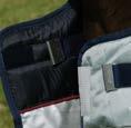 Zapínání na hrudi a křížové zapínání pod břichem koně. Deka kombinuje decentní barvy černou a šedou.
