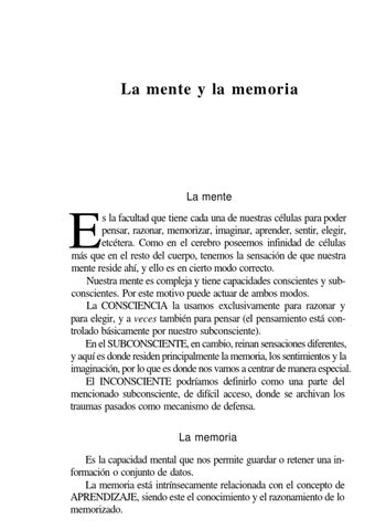 s la facultad que tiene cada una de nuestras células para poder pensar, razonar, memorizar, imaginar, aprender, sentir, elegir, etcétera. Como en el cerebro poseemos infinidad de células más que en el resto del cuerpo, tenemos la sensación de que nuestra mente reside ahí, y ello es en cierto modo correcto. Nuestra mente es compleja y tiene capacidades conscientes y subconscientes. Por este motivo puede actuar de ambos modos. La CONSCIENCIA la usamos exclusivamente para razonar y para elegir, y a veces también para pensar (el pensamiento está controlado básicamente por nuestro subconsciente). En el SUBCONSCIENTE, en cambio, reinan sensaciones diferentes, y aquí es donde residen principalmente la memoria, los sentimientos y la imaginación, por lo que es donde nos vamos a centrar de manera especial. El INCONSCIENTE podríamos definirlo como una parte del mencionado subconsciente, de difícil acceso, donde se archivan los traumas pasados como mecanismo de defensa. La memoria Es la capacidad mental que nos permite guardar o retener una información o conjunto de datos. La memoria está intrínsecamente relacionada con el concepto de APRENDIZAJE, siendo este el conocimiento y el razonamiento de lo memorizado.