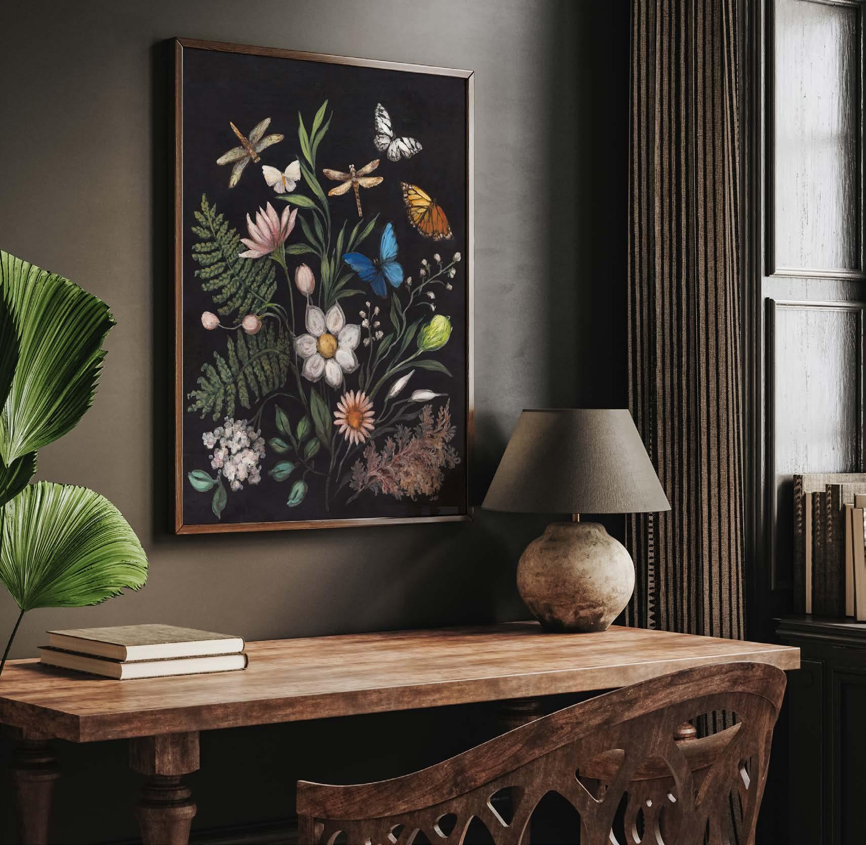 Moody Blooms, Bold Statements. This is where nature meets drama—Dark Botanical combines lush florals, woodland creatures, and shadowy tones for a look that’s equal parts elegant and mysterious.