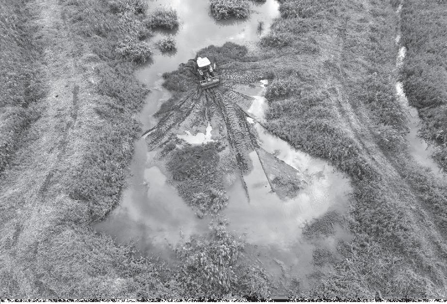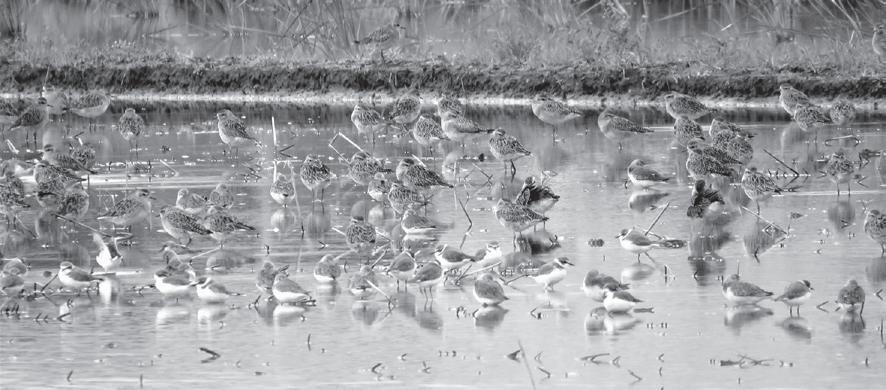 10月的工作重點是要將保育核心區的幾個小島用曳引機翻一遍,讓池灘可以維持較 大面積的裸露環境讓水鳥可以使用。此外,也有保留部分蘆葦叢作為擋風和提供給會使 用高莖草的陸鳥,有些區塊則保留部分稀疏的蘆葦讓田鷸躲藏。這幾年利用曳引機水田 模式的經營方法在管理濕地,再搭配每個月固定的引入半鹹淡水,不管是底棲生物或者 鳥的數量都有增加的趨勢,希望在這樣的綜合經營管理模式下可持續提供這些鳥一個適 合的棲息地。