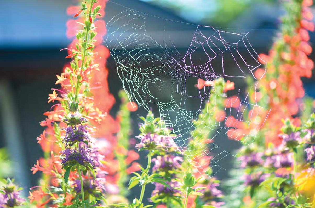 A large spider web built between lemon beebalm (Monarda citriodora) and standing cypress (Ipomopsis rubra). Andrew and Jared note that many pollinators call their gardens home.