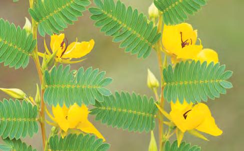 Partridge pea (Chamaecrista fasciculata) and gayfeather (Liatris punctata var. mucronata) make a complementary fall combination. PHOTO Wildflower Center
