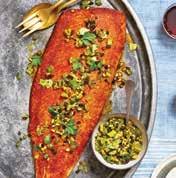 5. Topping: While salmon is in the oven, place a frying pan over medium heat. Add olive oil. When sizzling, add diced celery and sauté until wilted. Add pine nuts and sauté until slightly golden. Remove from heat, place sautéed ingredients in a bowl and add the rest of the ingredients. Toss and let cool to room temperature. Serve over roasted salmon.