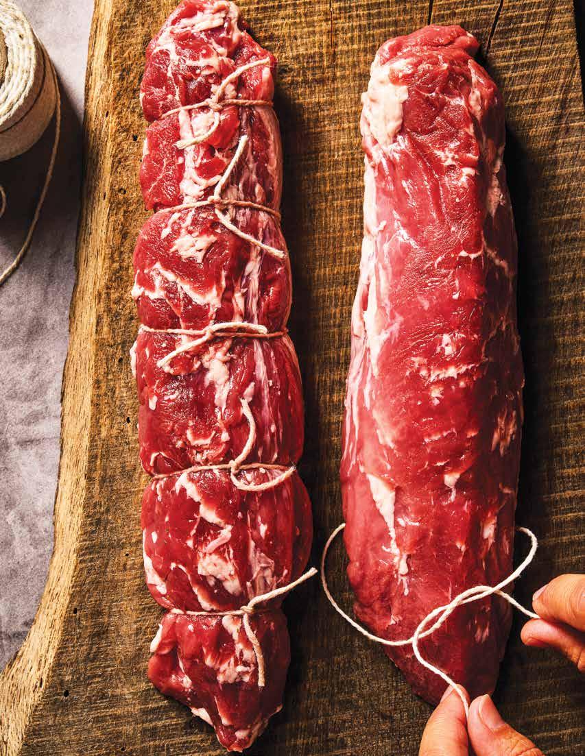 2. In order to get the beef to cook evenly– tie it up and make it as uniform in shape as possible. Simply cinch the meat in two-inch intervals with kitchen twine to secure it.