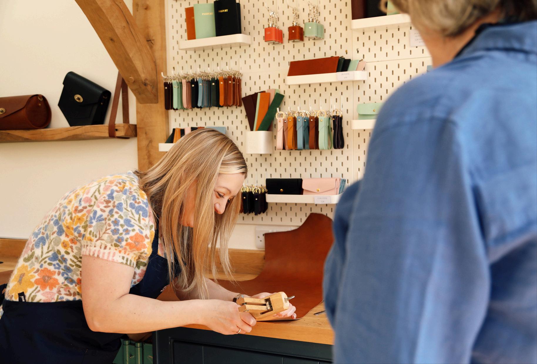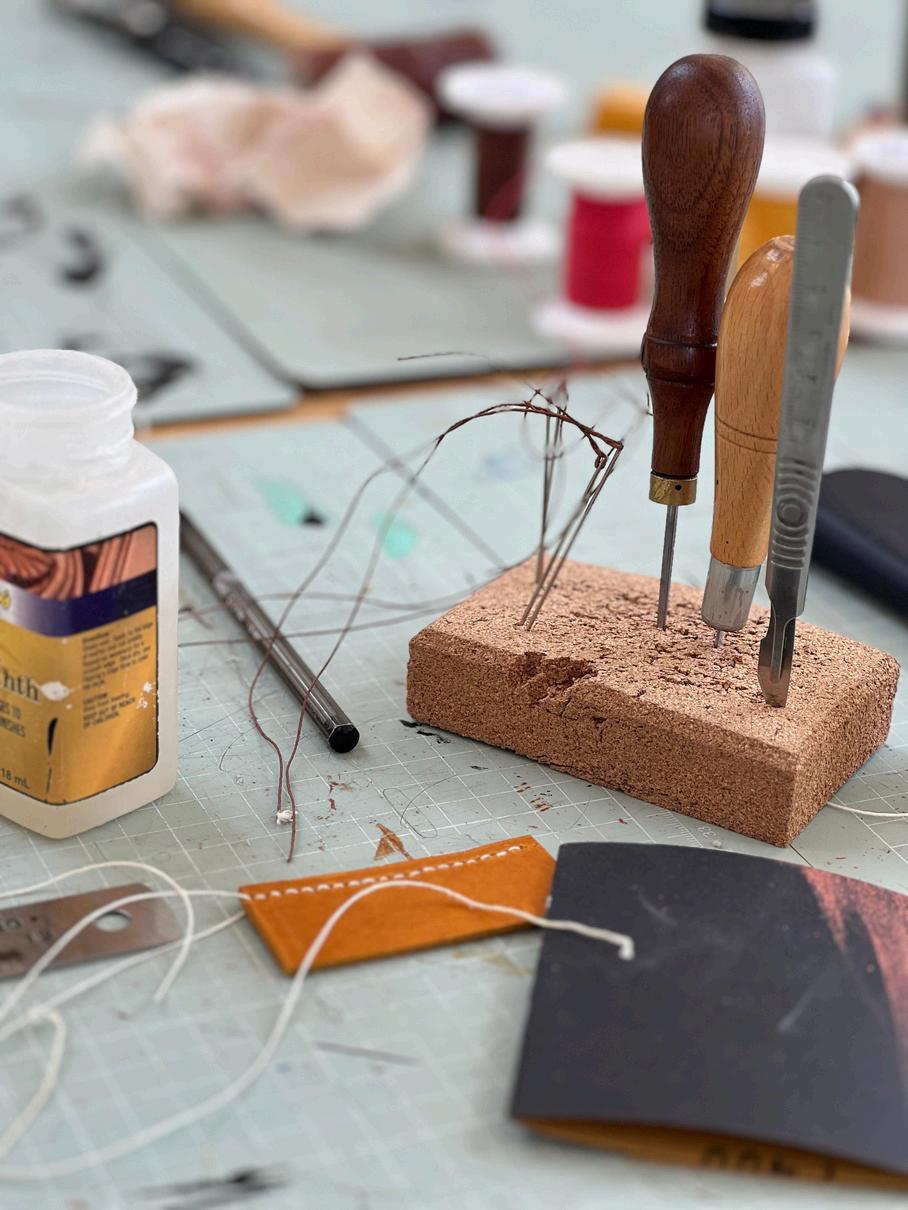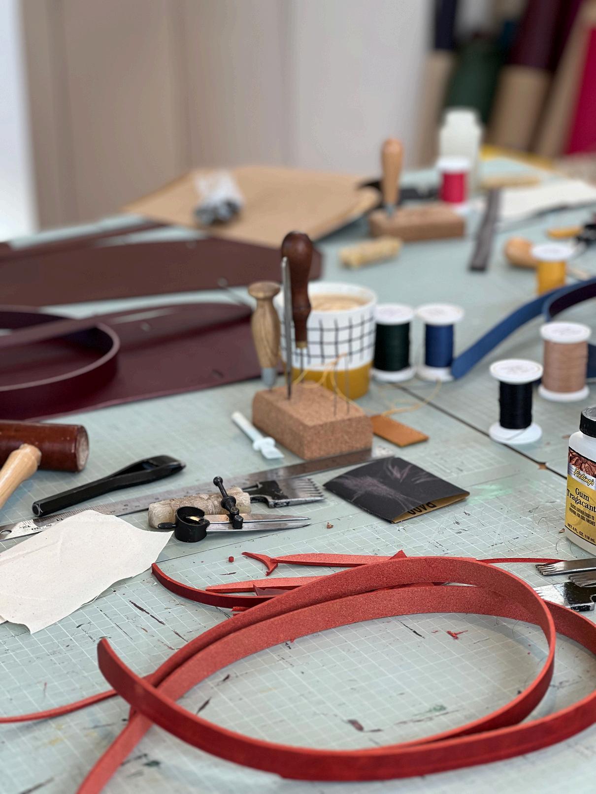 The materials we choose are exceptional Full grain, vegetable tanned, swoon-worthy leathers sourced from longstanding British and Italian suppliers Timeless brass fixings that feel special to touch To us, true style is outside of trends or fads It stands the test of time Our passion for leatherwork means we love to share what we know. At our Herefordshire workshop you can join a range of short courses, taking time to learn your own leather skills. Working slowly by hand, use our tools in each stage of the process - then stand back to admire what you ’ ve made. Through our range of sculptural leather goods and workshops, we hope you’ll discover leather and craftsmanship that endures.