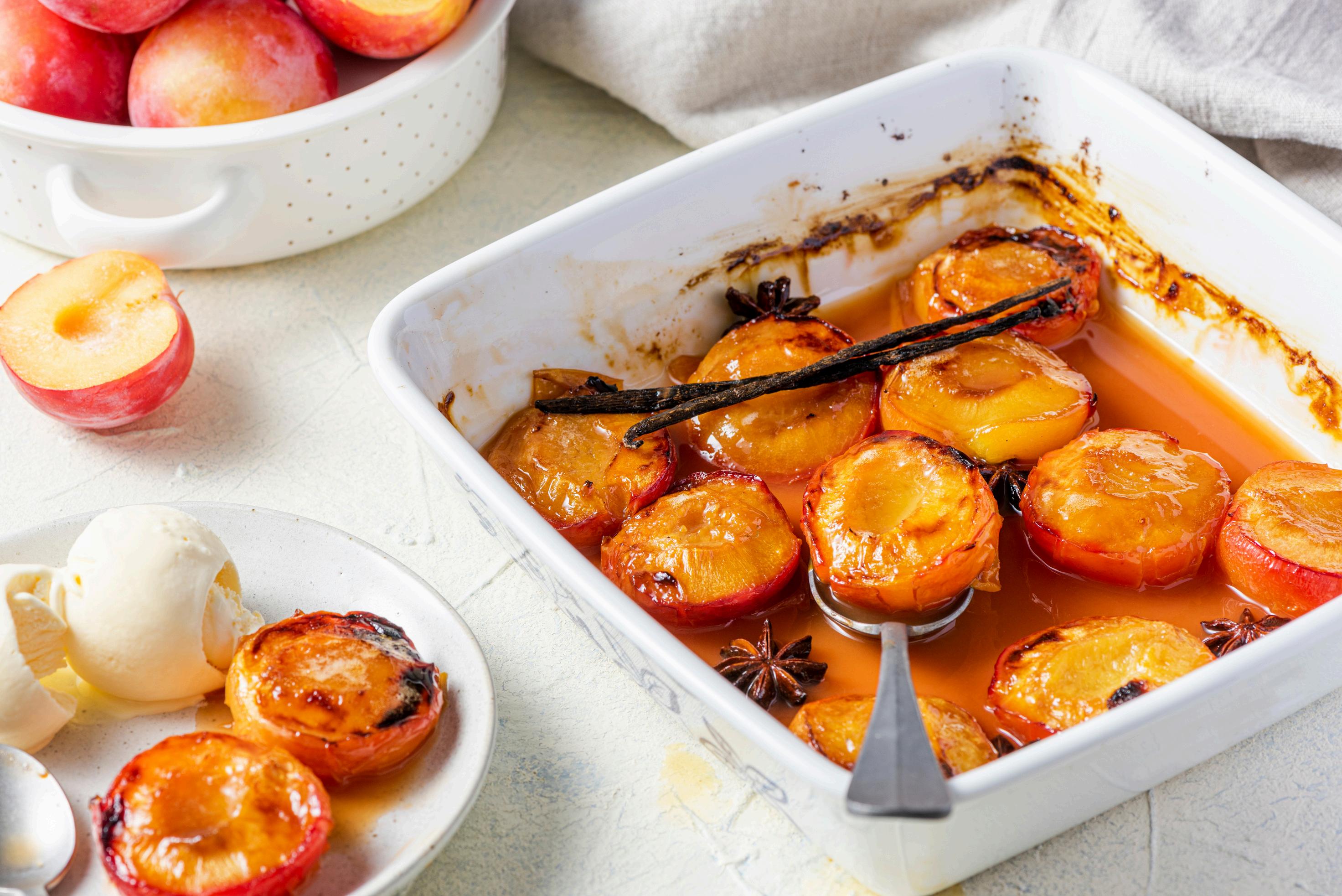 Using a slotted spoon, transfer plums to a large dish to cool. Put the roasting dish over a high heat on the hob Add a tablespoon of water if needed 4. Bring to the boil and cook for 3-4 minutes or reduce until syrupy. Cool then pour over the cooled plums. 5