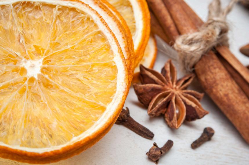 Materials: Dried orange slices, cloves, cinnamon sticks, rosemary sprigs