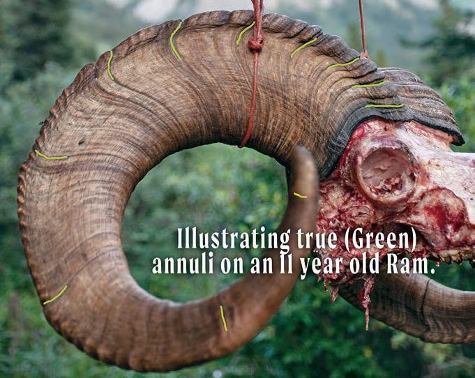 with every year. If you see a “ring” that breaks this pattern of incrementally smaller growth, it’s almost always going to be a false annuli, so treat it as such. Some rams have few, if any, false annuli; others may have many. As with horn coloration and growth, there is a wide array of possibilities—if you focus on finding that proportionally symmetrical pattern of horn growth and discounting anything that strays from that pattern, you are going to set yourself up for success in the field. Sheep hunting is a marathon, not a race, and so are the skills that are built with it. Over time, you will begin to see these patterns and quickly recognize what true and false annuli are, even from a distance.