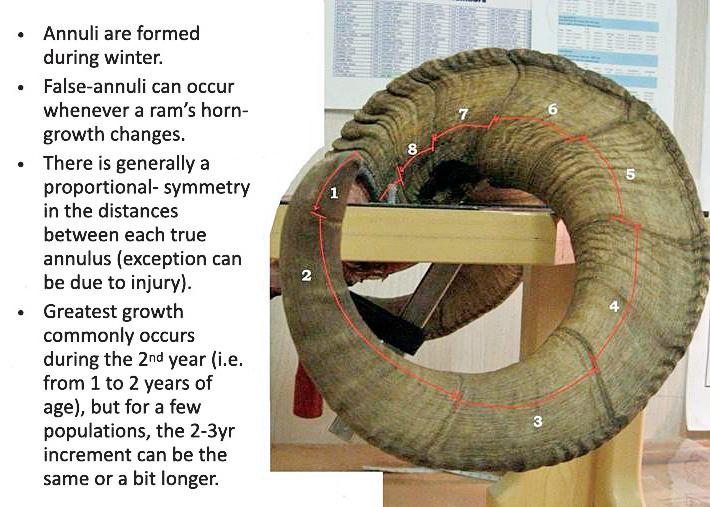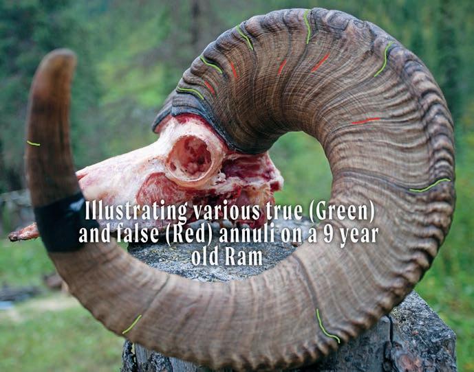 on the horn, often darker in colour. These typically do not extend across the front and rear surface of the horn, and they do not create a true separation in the longitudinal horn growth. From a distance, in a spotter, some may even appear as dark and convincing as true annuli. Still, the key here is remembering the notion of proportional symmetry—horn growth that gradually and consistently decreases in length