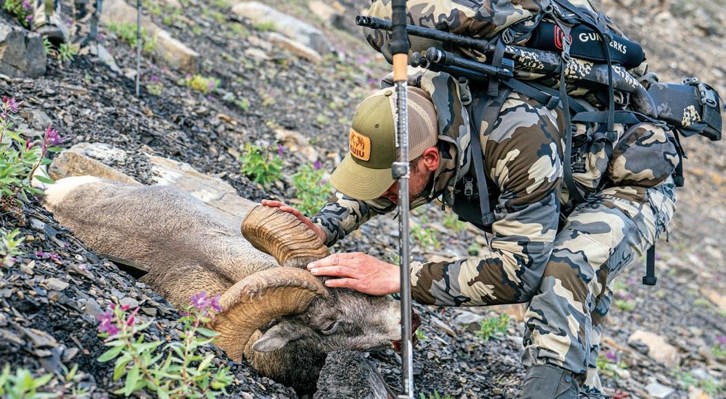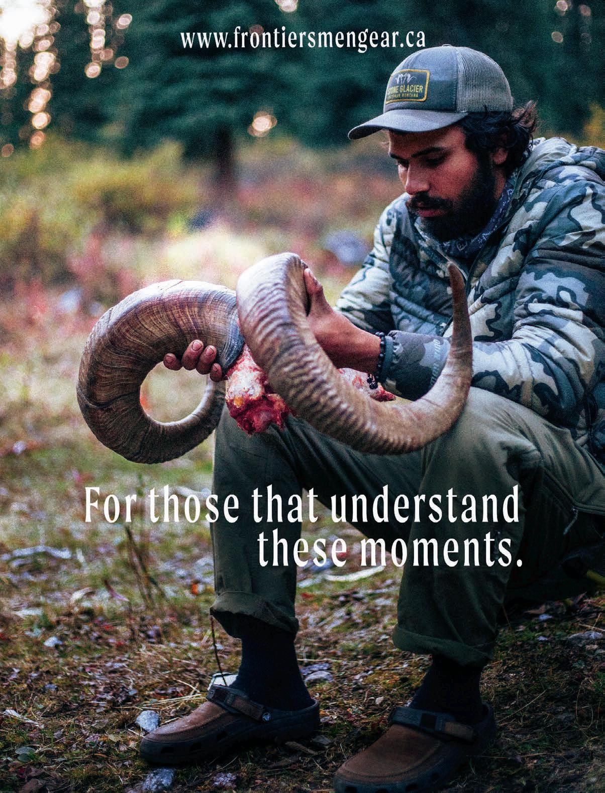 Every full-curl thinhorn is a legal ram—and therefore “fair game”— though I cannot stress enough the importance of being selective and passing on young rams. I firmly believe that our province’s regulations are designed to appeal to the lowest common denominator, and as avid sheep hunters and conservationists, we need to lead by example. There has never been more external pressure for the young mountain hunter to come home successful, and yet there’s never been a time that it mattered more to leave our up-and-coming sheep on the mountain. Those six- and seven-yearold full-curl rams are the future of our wild sheep, the most likely to survive the winter and pass on their genetics. Left to thrive, they carry the seed of our conservation efforts forward into the next generation of wild sheep. One that our children and grandchildren can grow to see wild, as they always have been, and as our forebearers once experienced them.
