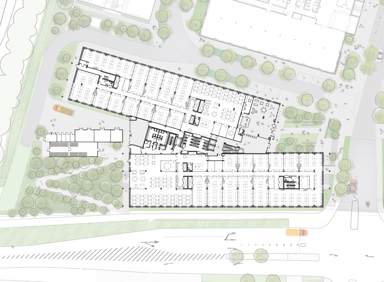 At the centre of the site, a new building houses shared teaching facilities, an information and research hub for the University Library, academic accommodation, and an energy centre serving the whole site. This building will also include a section of retained façade from a