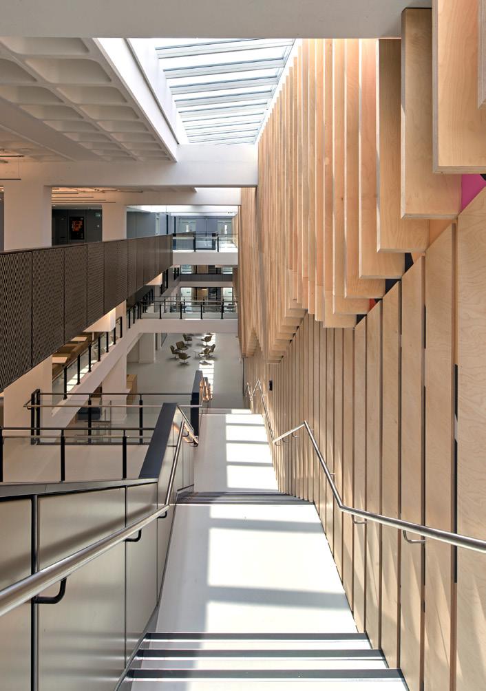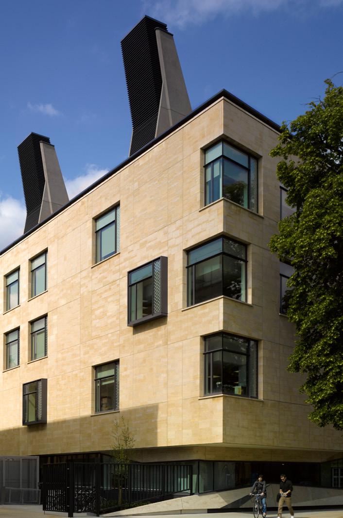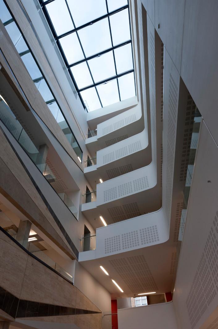 The building is arranged programmatically, with teaching spaces on the lower floors and staff accommodation above. It has been designed as a predominantly naturally ventilated building, with the specialist spaces that require supplementary mechanical ventilation and cooling placed in the centre of each floorplate. This efficient use of energy has resulted in an annual energy consumption of 18.9kg CO2/m².