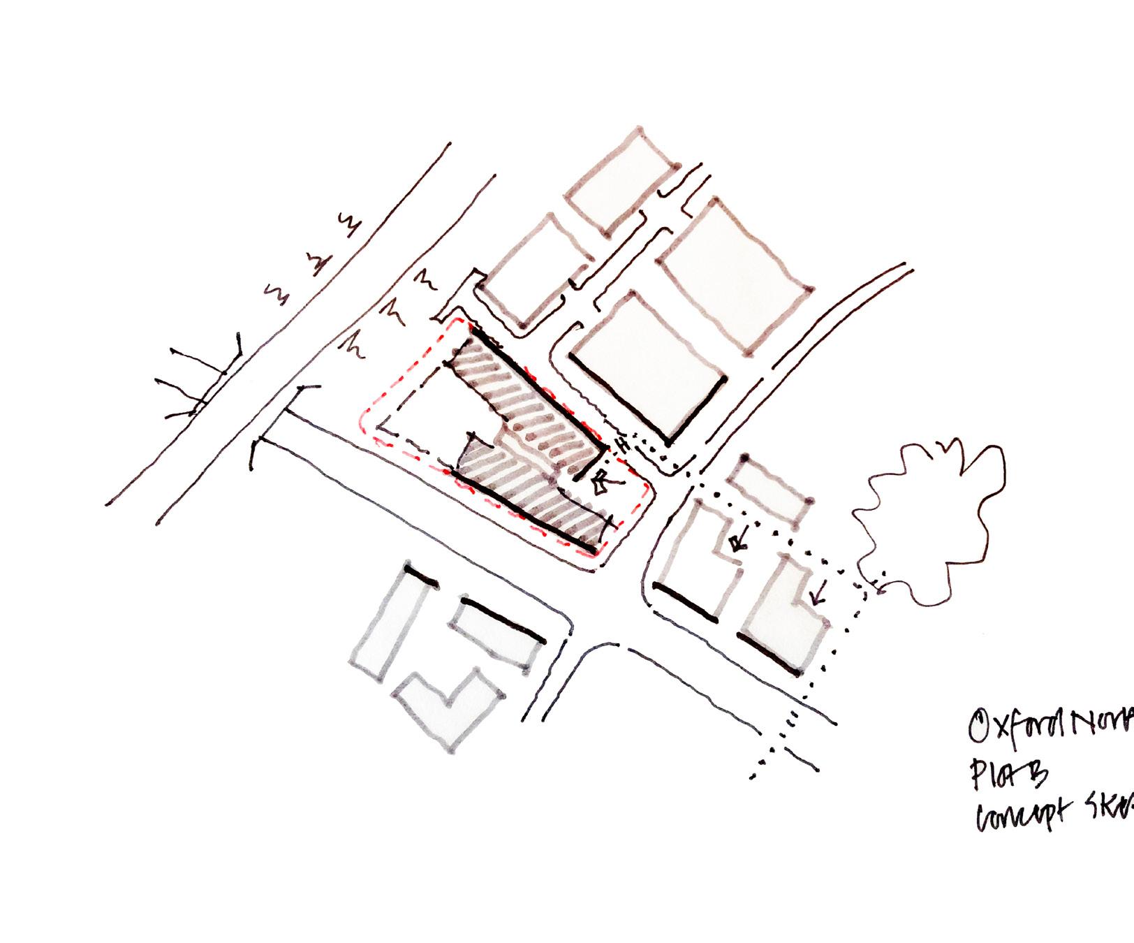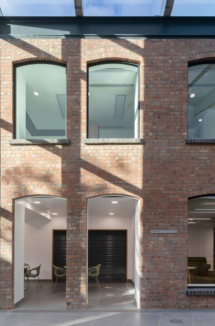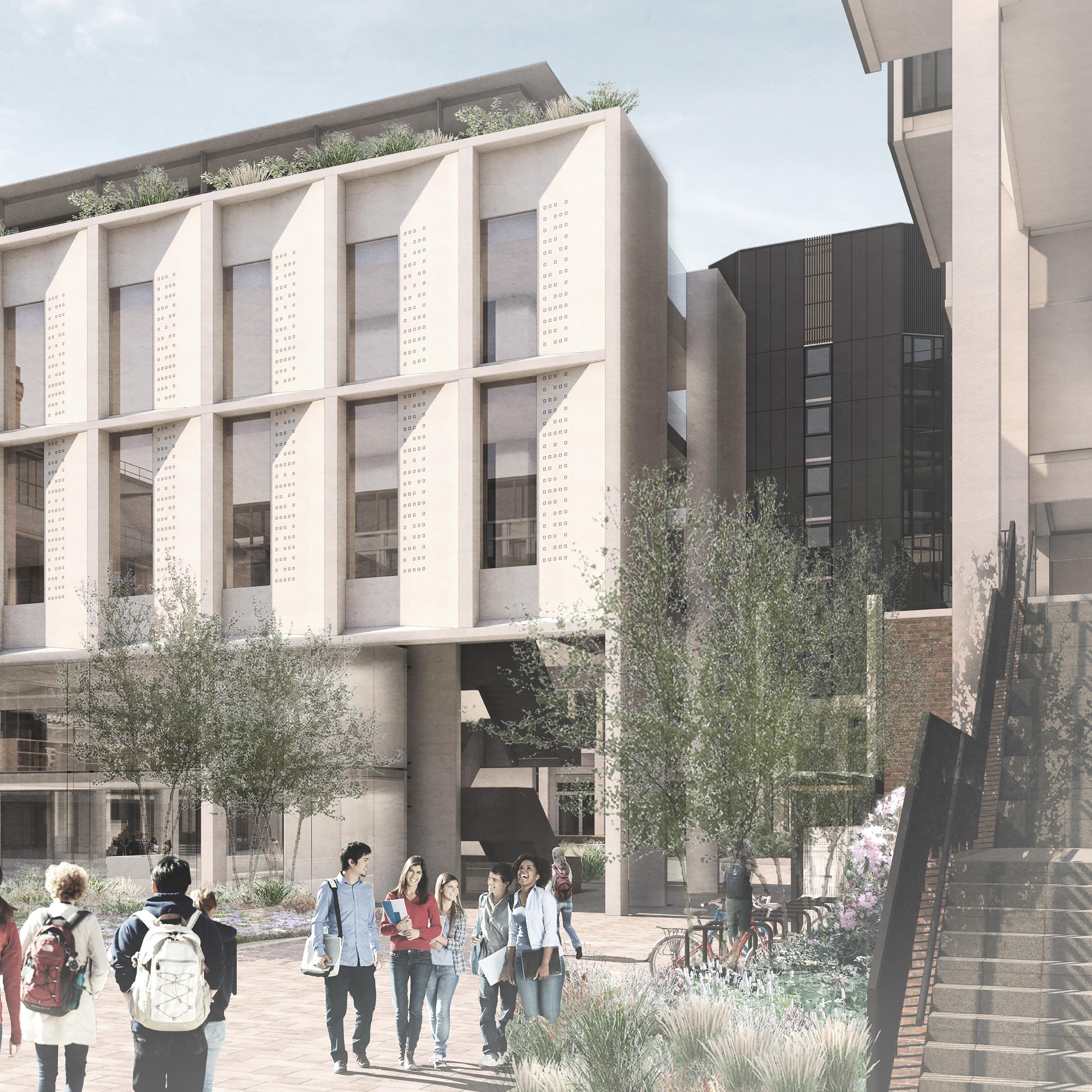Along the southern edge of the site, a 1930s building will be carefully demolished while an older section of historic façade facing Pembroke Street is retained. A new building will then constructed behind the retained façade to accommodate academic offices and research laboratories. A large external arcade is created at ground floor level below the building and three new openings are formed in the retained façade to provide improved access to the site for pedestrians.
