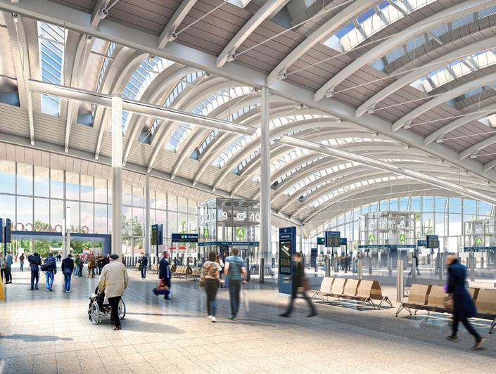 A series of underground high-speed platforms are linked by a shared overbridge providing connections to conventional rail services. The station’s distinctiveness is defined by a spectacular vaulted roof inspired by the industrial heritage of the adjacent Great Western Railway.