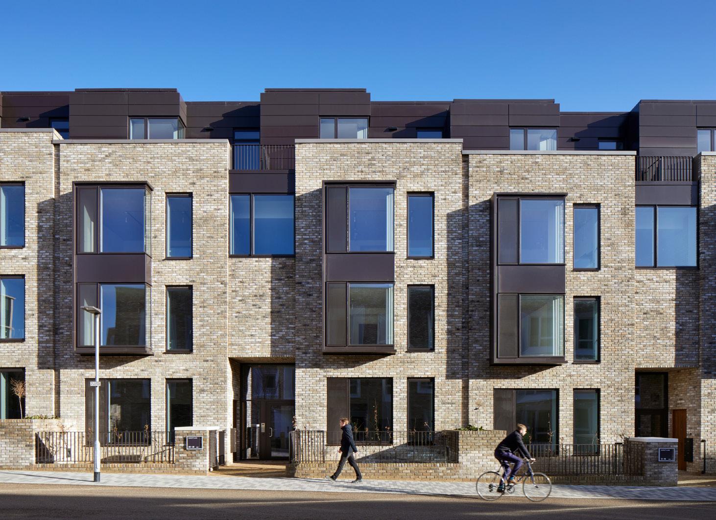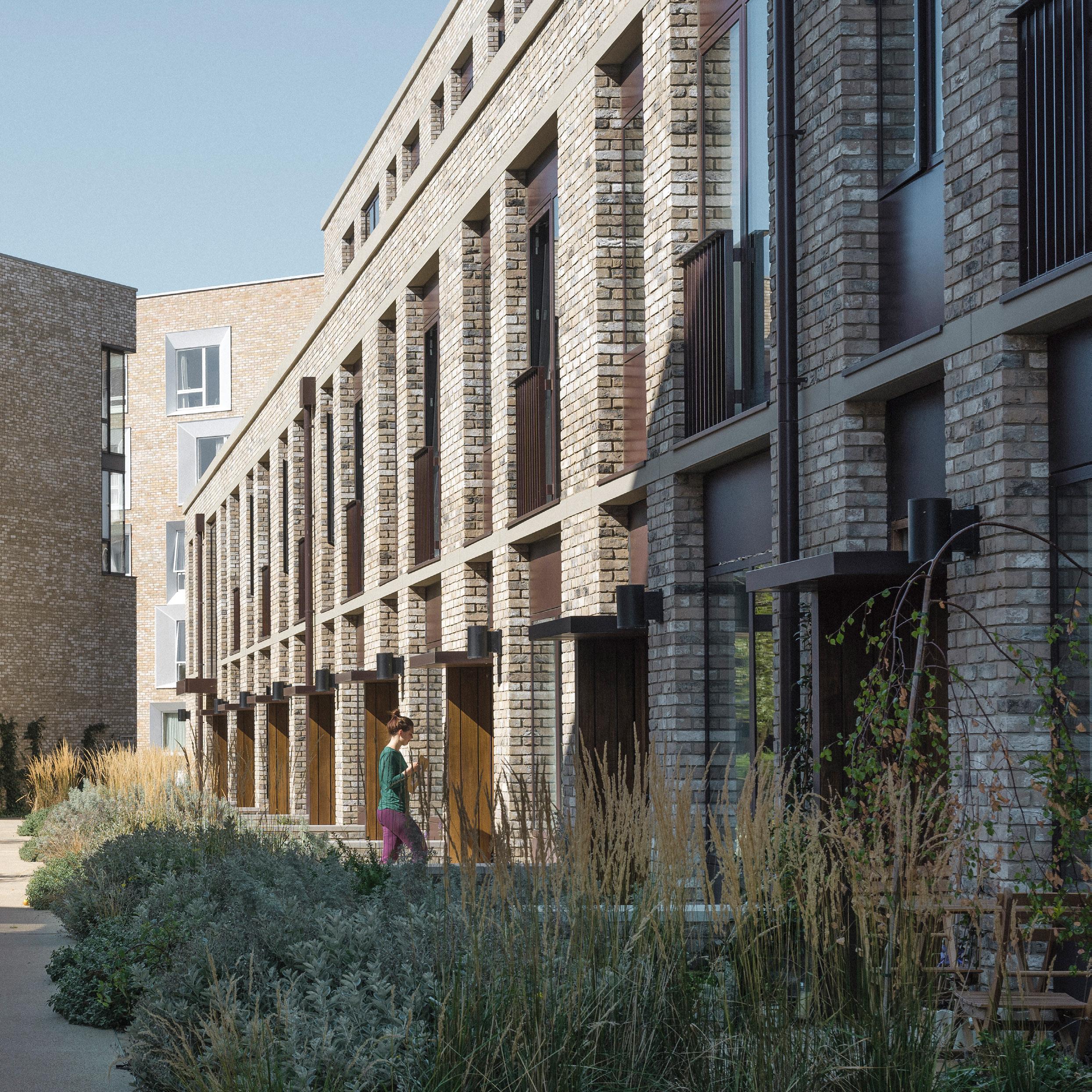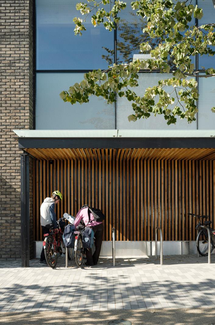A series of maisonette apartments (opposite) address the street with each vertical block articulated by entrances, projecting bay windows, and a set-back top floor. The open-air marketplace creates a dynamic and vibrant place to congregate at the heart of the development. Shared amenities like cycle parking are carefully integrated into the neighbourhood plan.