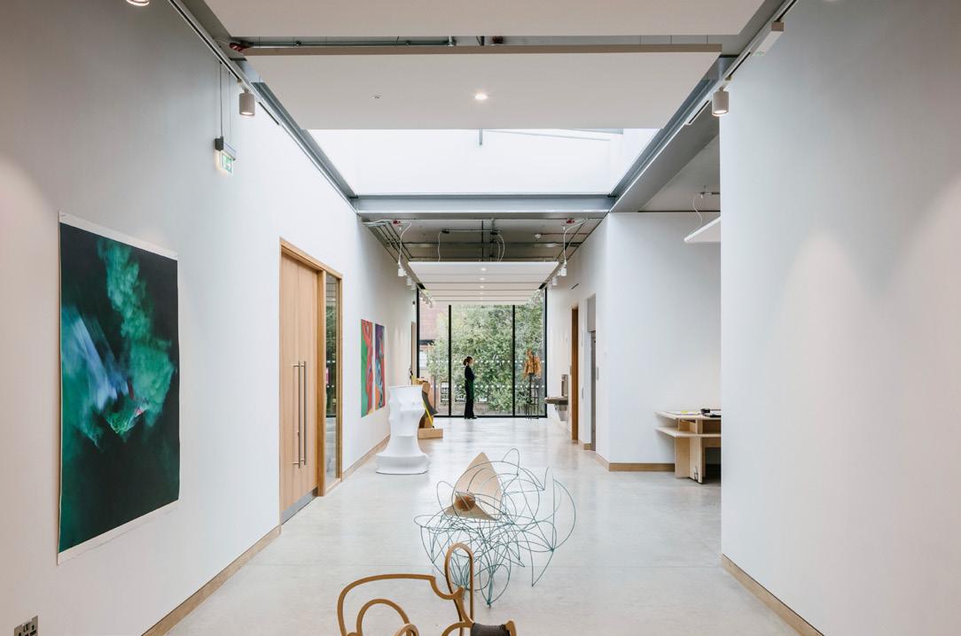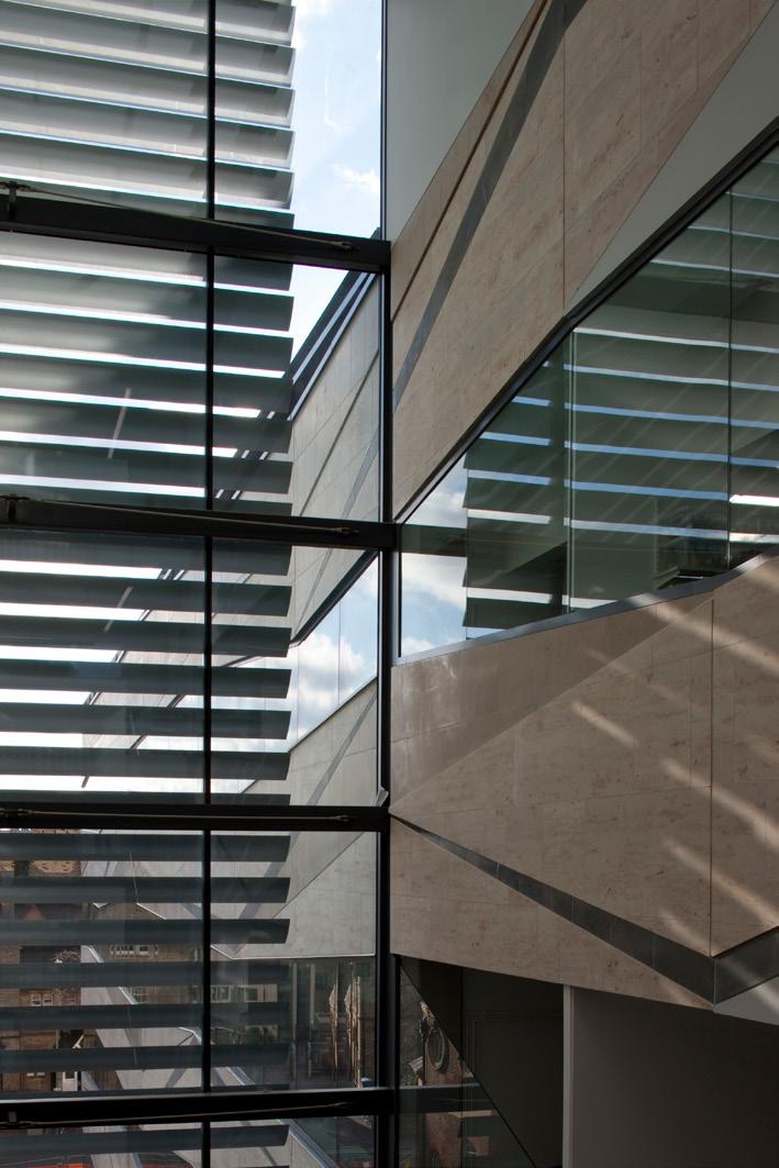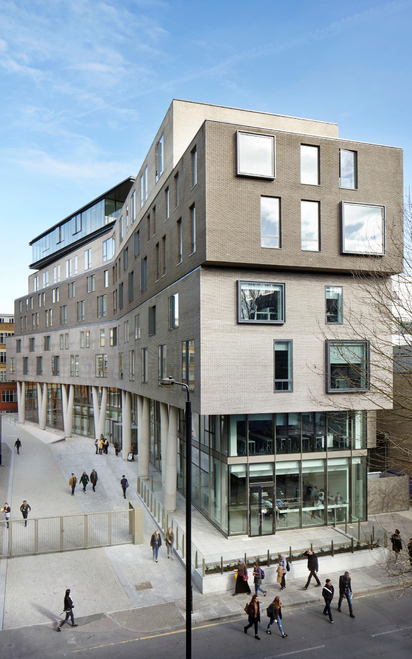 A glazed corridor with external brise-soleil acts as a buffer zone to the first and second floors, sheltering the academic office space from the busy Mile End Road outside, such that they are all naturally ventilated and look into an internal courtyard.