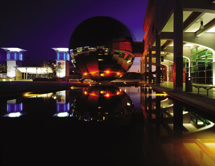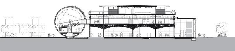 The existing reinforced concrete structure was sympathetically restored and adapted; new glazing at ground floor level was set back from the existing grid to create an arcade and allow the rhythm of the building’s frame to remain visible. A bridge from the first floor gallery leads to a planetarium, housed in a shiny stainless steel sphere 15m in diameter, and partially surrounded by water.