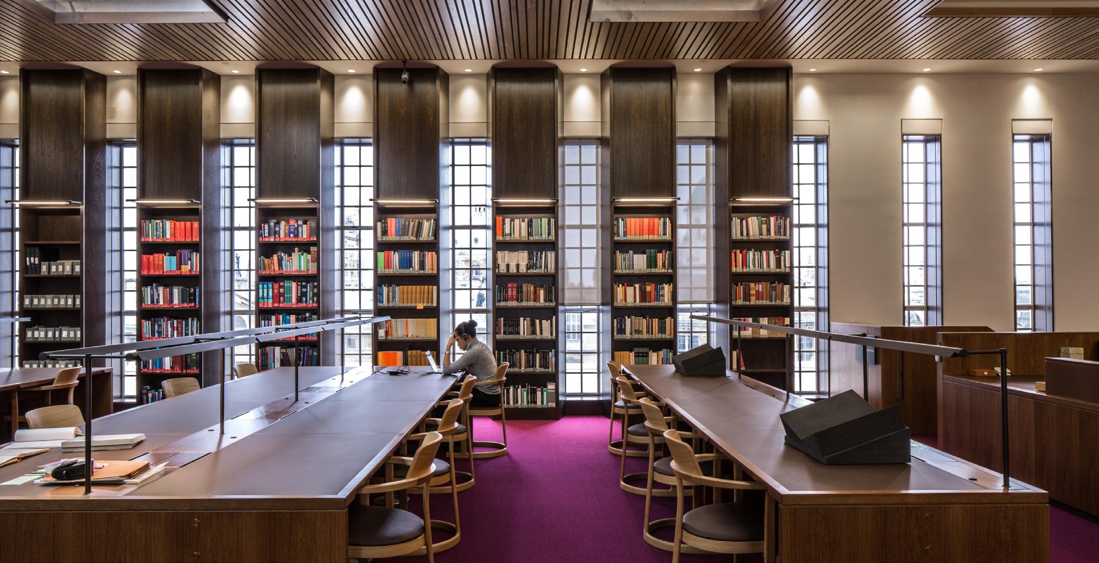 A series of characterful spaces have been created throughout the building: A new education suite (below left) is designed to encourage flexibility and collaboration with whiteboard walls, integrated display and sliding/folding partitions that allow the spaces to be used in different modes. The refurbished reading room (below right) integrates exhibitions along with space for informal learning and more formal research activities.