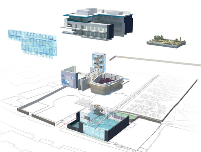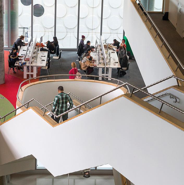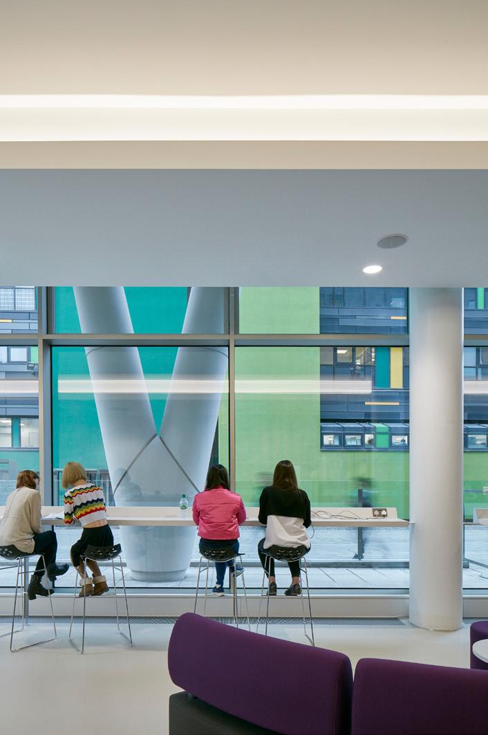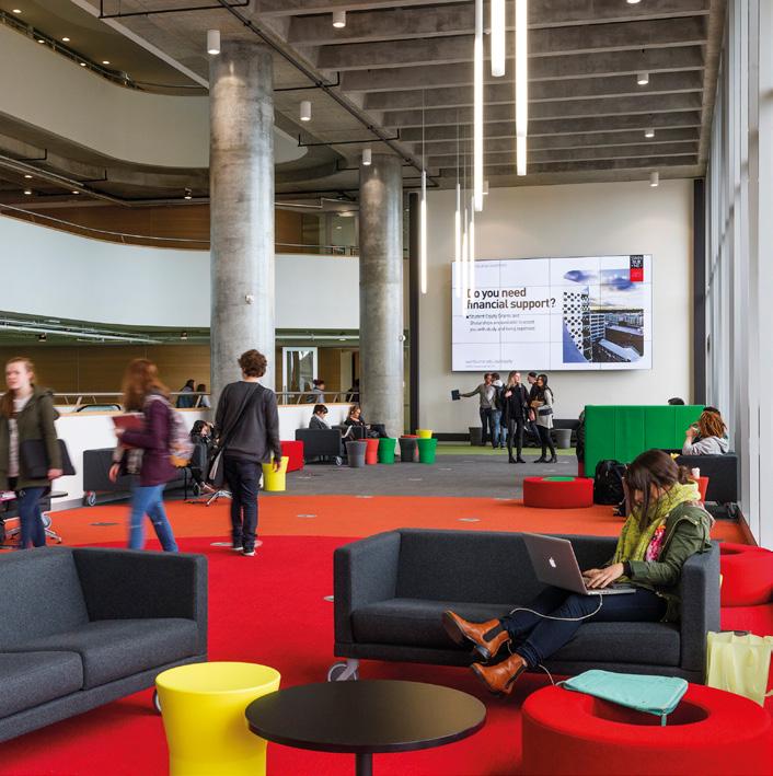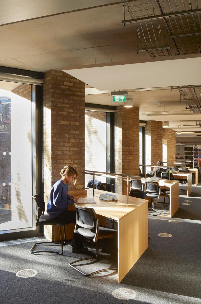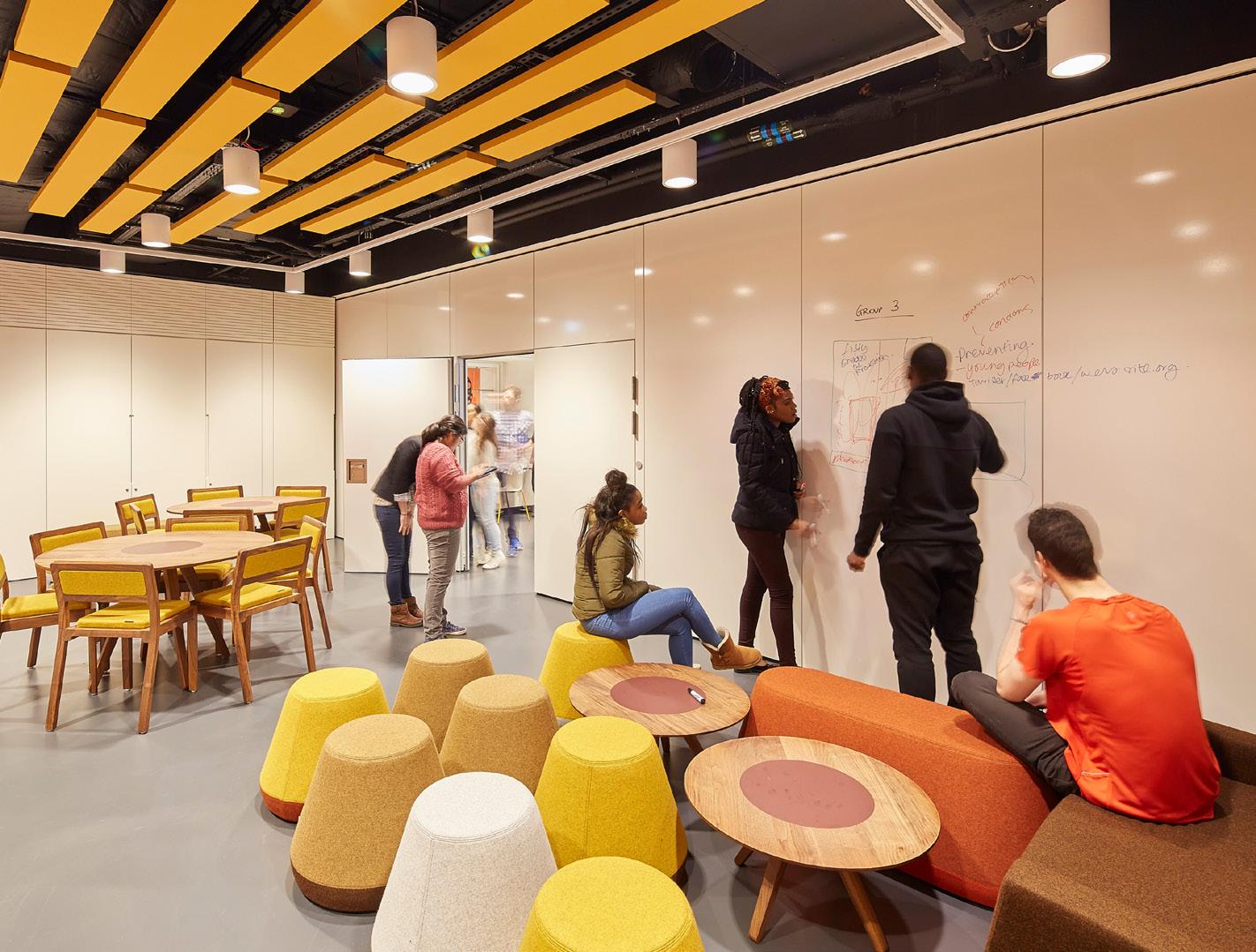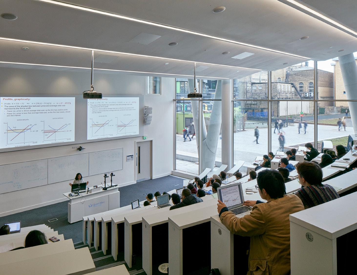 We understand the requirements for traditional teaching and learning spaces from raked lecture theatres to flatfloored seminar rooms. This understanding has allowed us to refine our approach to designing and improving these spaces with things like the addition of natural light – as with the raked lecture theatre at Queen Mary University of London’s new Graduate Centre – or through the colocation and flexible timetabling of spaces as at Exeter Forum. We have also designed a range of other more interactive teaching spaces that use the latest in digital technology to support new ways of delivering curriculum. It is often the combination of these different space types –both formal and informal – that support the best teaching and learning outcomes.